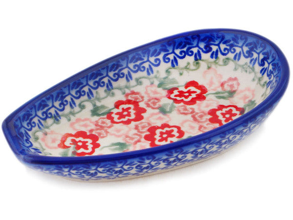 This Polish Pottery Spoon Rest is handmade and handpainted by the Ceramika Bona factory in Boleslawiec, Poland. Manufacturer item number H0281P. It is 1½" high and measures 5½" by 3¼". The weight of this Spoon Rest is 0.3 lbs. It is part of the Fluctuating Pansy's Collection.