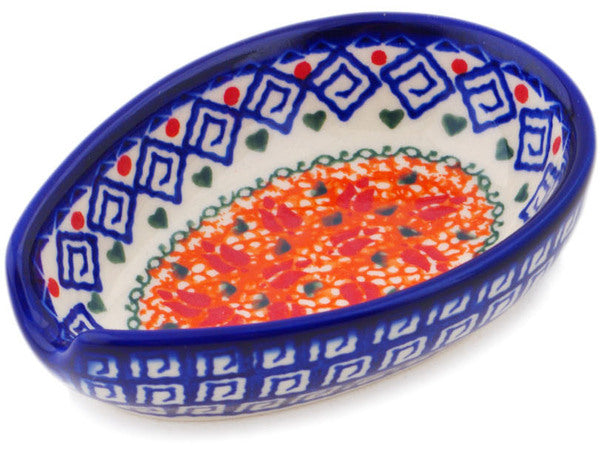 This Polish Pottery Spoon Rest is handmade and handpainted by the Ceramika Bona factory in Boleslawiec, Poland. Manufacturer item number H9703Q. It is 1½" high and measures 5" by 3½". The capacity of this Spoon Rest is 5.07 oz (brimful) and it weighs 0.5 lbs. It is part of the Grecian Fire Tulips Collection.