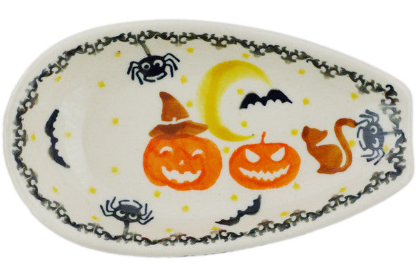 This Polish Pottery Spoon Rest is handmade and handpainted by the Ceramika Bona factory in Boleslawiec, Poland. Manufacturer item number H2592P. It is 1½" high and measures 5½" by 3¼". The weight of this Spoon Rest is 0.3 lbs. It is part of the Halloween Spooky Pumpkin Collection.