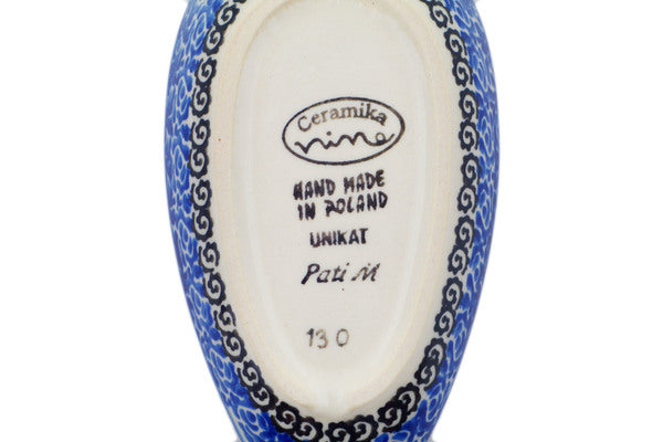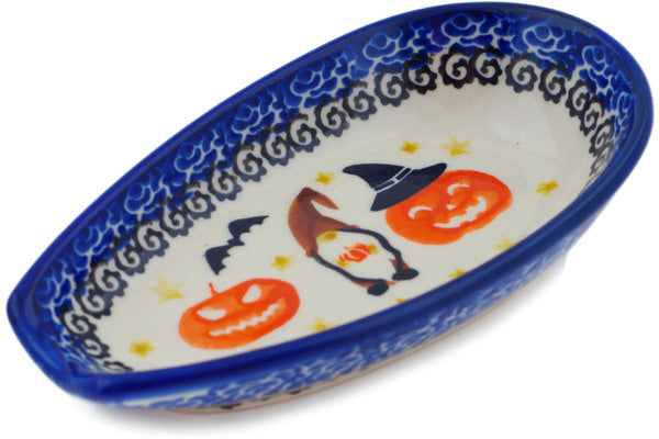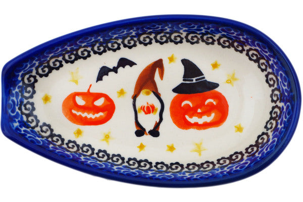 This Polish Pottery Spoon Rest is handmade and handpainted by the Ceramika Nina factory in Boleslawiec, Poland. Manufacturer item number H1457P. It is 1½" high and measures 5½" by 3¼". The weight of this Spoon Rest is 0.3 lbs. It is part of the Harvest Haunt Collection.