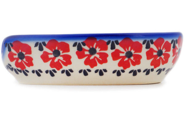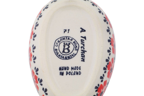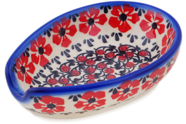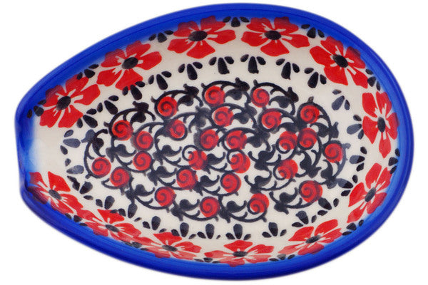 This Polish Pottery Spoon Rest is handmade and handpainted by the Ceramika Bona factory in Boleslawiec, Poland. Manufacturer item number H7118Q. It is 1½" high and measures 5" by 3½". The capacity of this Spoon Rest is 5.07 oz (brimful) and it weighs 0.5 lbs. It is part of the Hawaiian Bliss Collection.