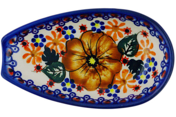 This Polish Pottery Spoon Rest is handmade and handpainted by the Ceramika Bona factory in Boleslawiec, Poland. Manufacturer item number H5695R. It is 1½" high and measures 5½" by 3¼". The weight of this Spoon Rest is 0.3 lbs. It is part of the Mauve Poppies Collection.