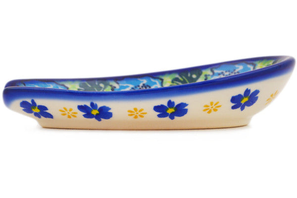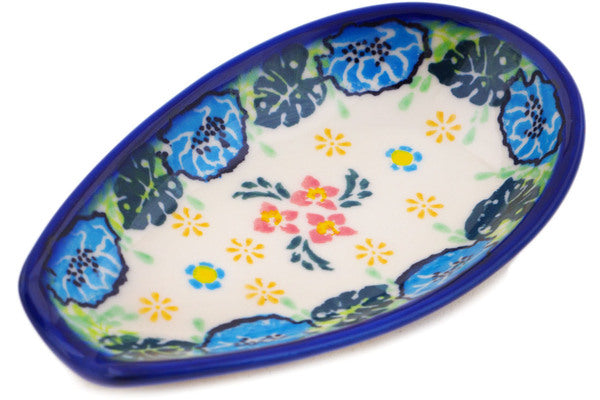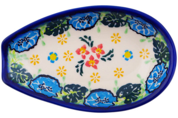 This Polish Pottery Spoon Rest is handmade and handpainted by the Dalia factory in Boleslawiec, Poland. Manufacturer item number H1418R. It is 1¼" high and measures 4½" by 2¾". The weight of this Spoon Rest is 0.2 lbs. It is part of the Monstera Blooms Collection.