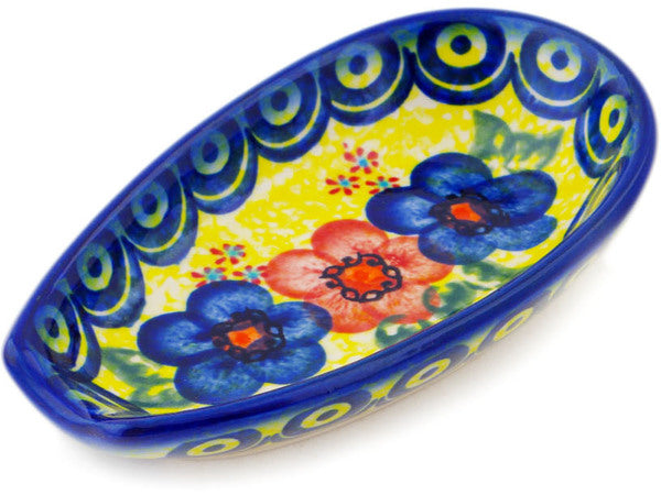 This Polish Pottery Spoon Rest is handmade and handpainted by the Ceramika Bona factory in Boleslawiec, Poland. Manufacturer item number H9620Q. It is 1½" high and measures 5½" by 3¼". The weight of this Spoon Rest is 0.3 lbs. It is part of the Neon Poppies Collection.