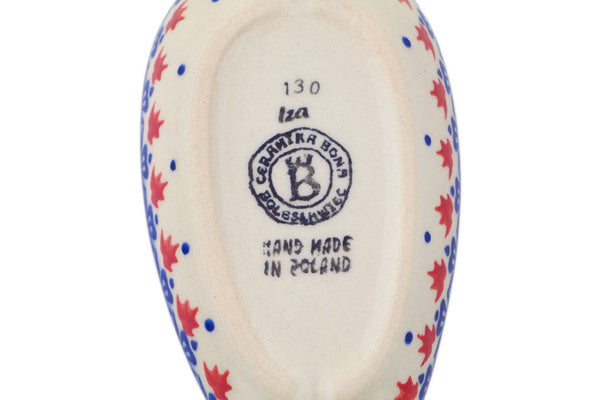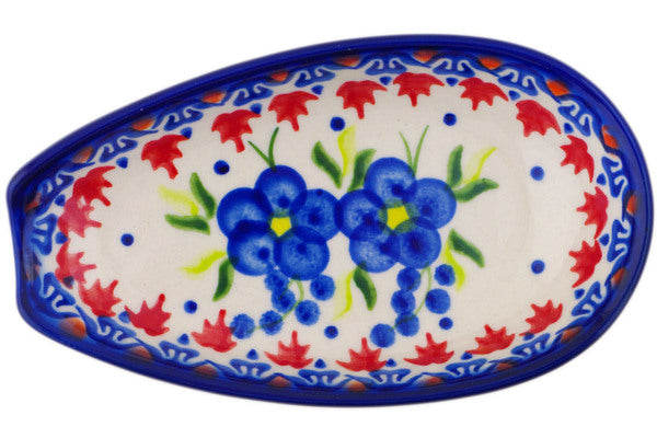 This Polish Pottery Spoon Rest is handmade and handpainted by the Ceramika Bona factory in Boleslawiec, Poland. Manufacturer item number H8944P. It is 1½" high and measures 5½" by 3¼". The weight of this Spoon Rest is 0.3 lbs. It is part of the Passion Poppy Collection.