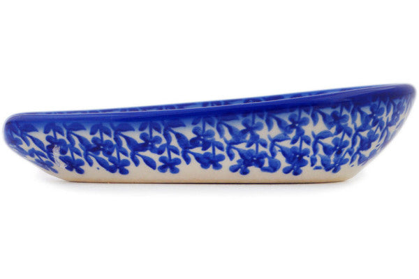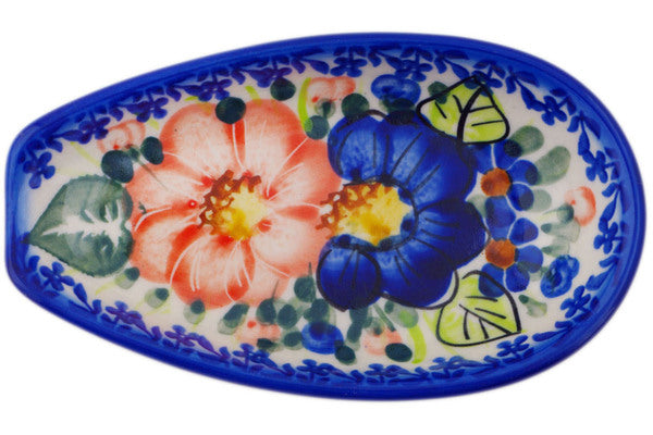 This Polish Pottery Spoon Rest is handmade and handpainted by the Ceramika Bona factory in Boleslawiec, Poland. Manufacturer item number H7168Q. It is 1½" high and measures 5½" by 3¼". The weight of this Spoon Rest is 0.3 lbs. It is part of the Poppy Trio Collection.