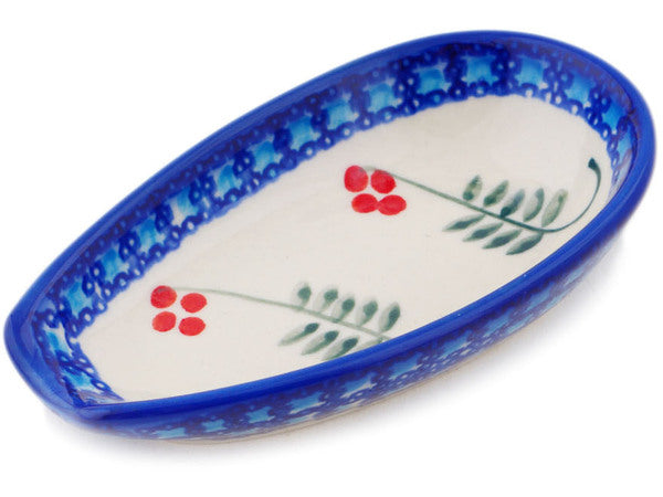 This Polish Pottery Spoon Rest is handmade and handpainted by the Ceramika Bona factory in Boleslawiec, Poland. Manufacturer item number H0117Q. It is 1½" high and measures 5½" by 3¼". The weight of this Spoon Rest is 0.3 lbs. It is part of the Red Berries Collection.