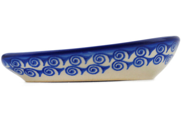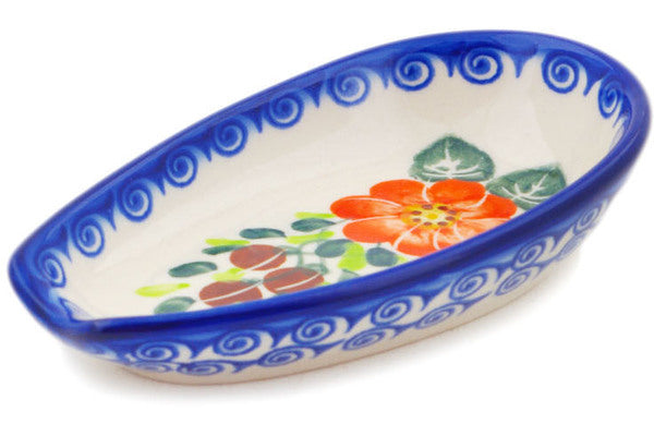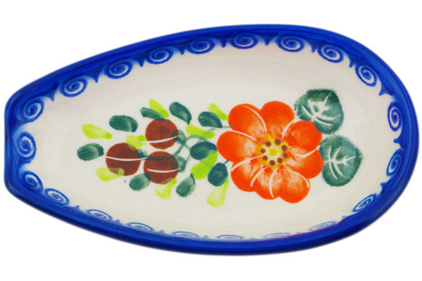 This Polish Pottery Spoon Rest is handmade and handpainted by the Ceramika Bona factory in Boleslawiec, Poland. Manufacturer item number H8688P. It is 1½" high and measures 5½" by 3¼". The weight of this Spoon Rest is 0.3 lbs. It is part of the Red Blossom Collection.