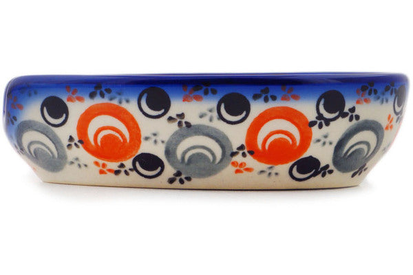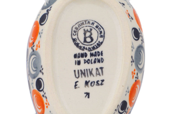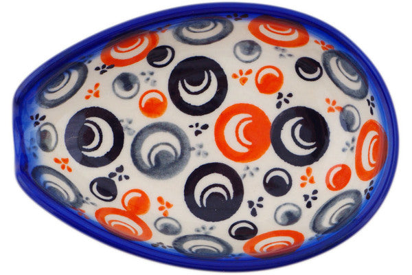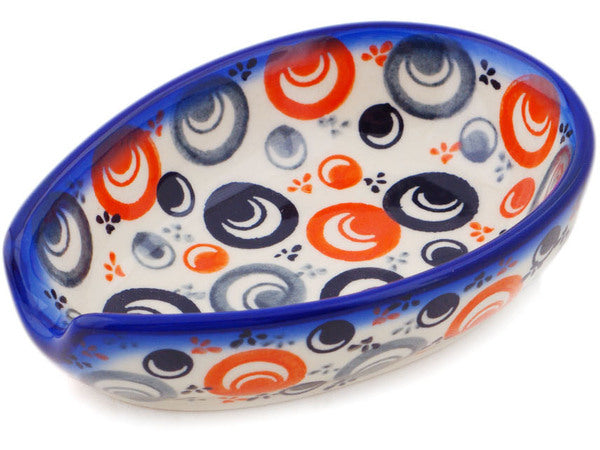 This Polish Pottery Spoon Rest is handmade and handpainted by the Ceramika Bona factory in Boleslawiec, Poland. Manufacturer item number H7123Q. It is 1½" high and measures 5" by 3½". The capacity of this Spoon Rest is 5.07 oz (brimful) and it weighs 0.5 lbs. It is part of the Red Peacock Eye Collection.