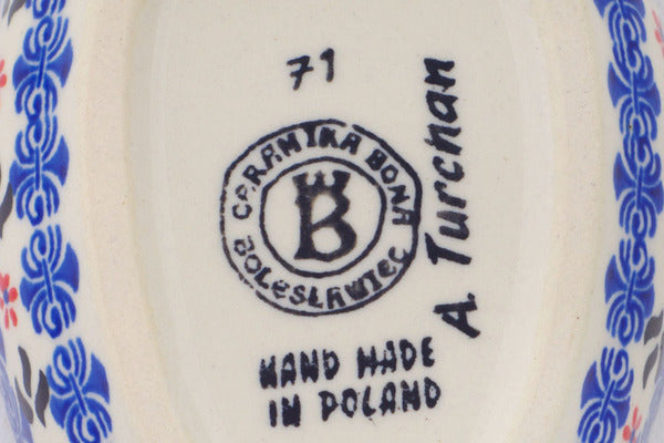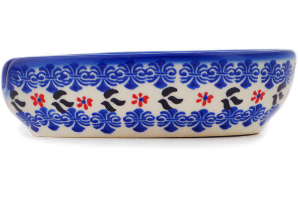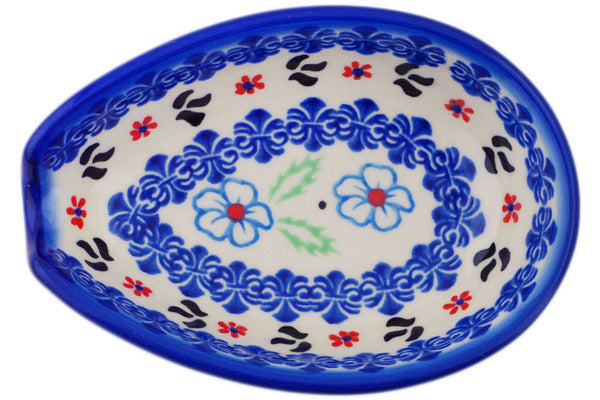 This Polish Pottery Spoon Rest is handmade and handpainted by the Ceramika Bona factory in Boleslawiec, Poland. Manufacturer item number H1960R. It is 1½" high and measures 5" by 3½". The capacity of this Spoon Rest is 5.07 oz (brimful) and it weighs 0.5 lbs. It is part of the Sweet Day Collection.