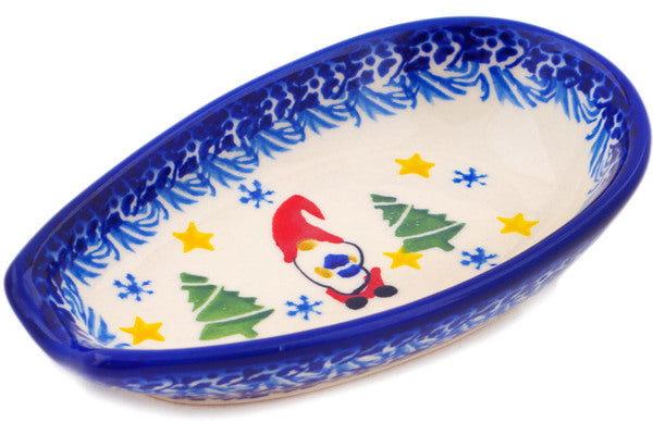 This Polish Pottery Spoon Rest is handmade and handpainted by the Ceramika Nina factory in Boleslawiec, Poland. Manufacturer item number H1385P. It is 1½" high and measures 5½" by 3¼". The weight of this Spoon Rest is 0.3 lbs. It is part of the Twinkle Twinkle Little Gnome Collection.
