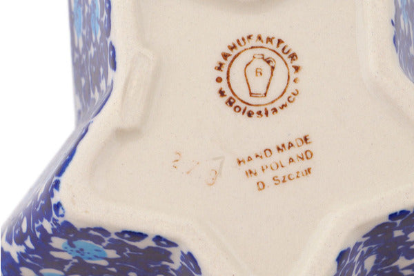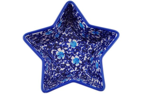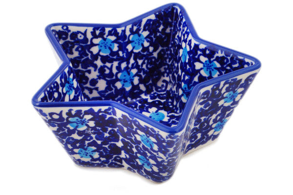 This Polish Pottery Star Shaped Bowl is handmade and handpainted by the Manufaktura factory in Boleslawiec, Poland. Manufacturer item number H7283P. It is 2¾" high and measures 5¼" by 5¼". The capacity of this Star Shaped Bowl is 6.36 oz (brimful) and it weighs 0.5 lbs. It is part of the Flowers On The Lake Collection.