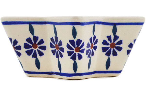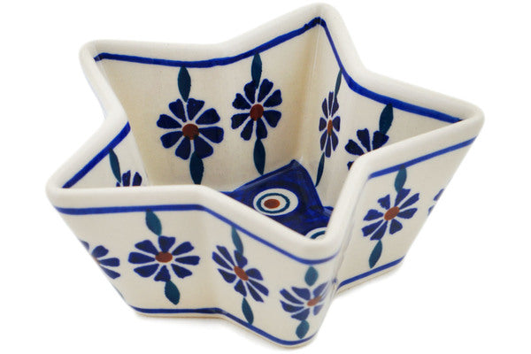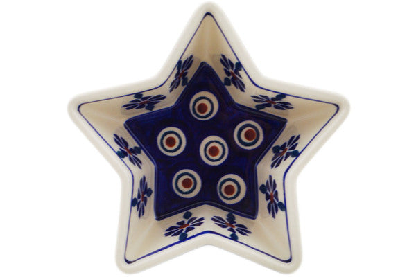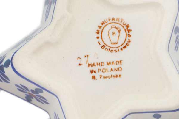 This Polish Pottery Star Shaped Bowl is handmade and handpainted by the Manufaktura factory in Boleslawiec, Poland. Manufacturer item number H7381P. It is 2¾" high and measures 5¼" by 5¼". The capacity of this Star Shaped Bowl is 6.36 oz (brimful) and it weighs 0.5 lbs. It is part of the Peacock Collection.