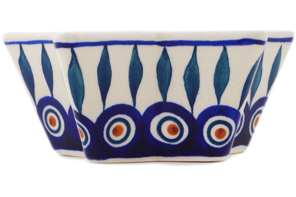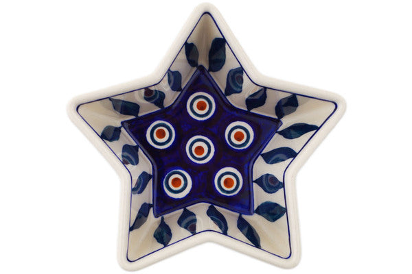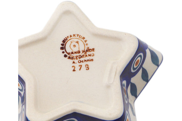 This Polish Pottery Star Shaped Bowl is handmade and handpainted by the Manufaktura factory in Boleslawiec, Poland. Manufacturer item number H7422P. It is 2¾" high and measures 5¼" by 5¼". The capacity of this Star Shaped Bowl is 6.36 oz (brimful) and it weighs 0.5 lbs. It is part of the Peacock Leaves Collection.