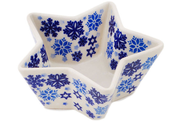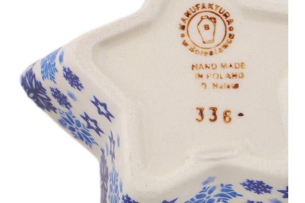 This Polish Pottery Star Shaped Bowl is handmade and handpainted by the Manufaktura factory in Boleslawiec, Poland. Manufacturer item number H7137P. It is 2¾" high and measures 5¼" by 5¼". The capacity of this Star Shaped Bowl is 6.36 oz (brimful) and it weighs 0.5 lbs. It is part of the Snowdrift Collection.