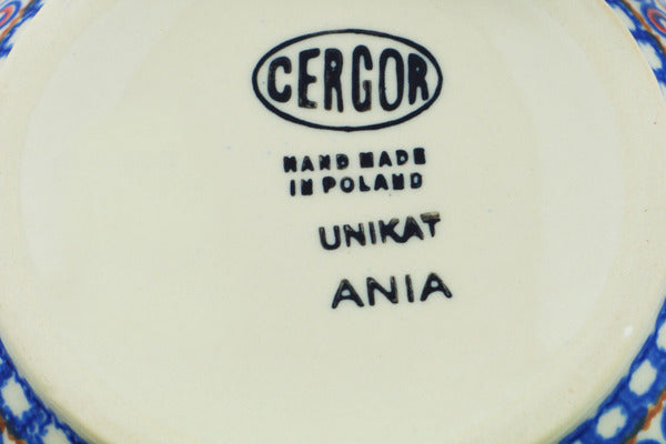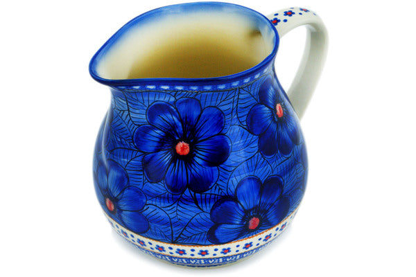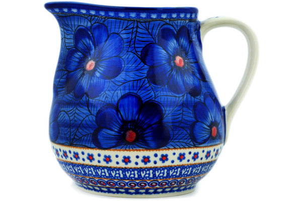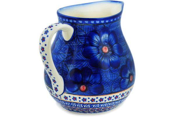 This Polish Pottery Pitcher is handmade and handpainted by the Cergor factory in Boleslawiec, Poland. Manufacturer item number H8457N. It is 6¼" high and measures 7½" by 6". The capacity of this Pitcher is 54.10 oz (brimful) and it weighs 2.0 lbs. It is part of the Blue Heaven Collection.