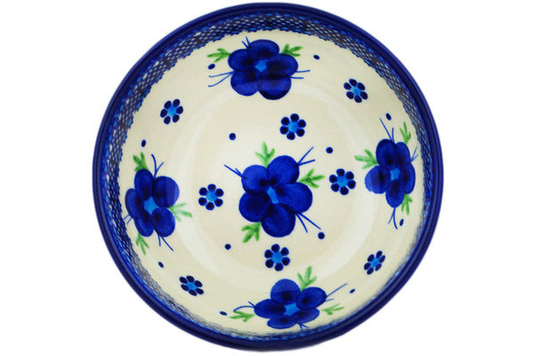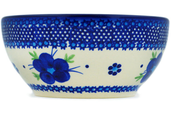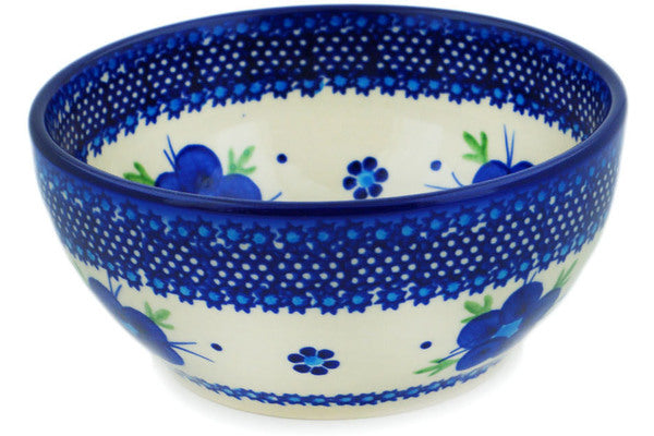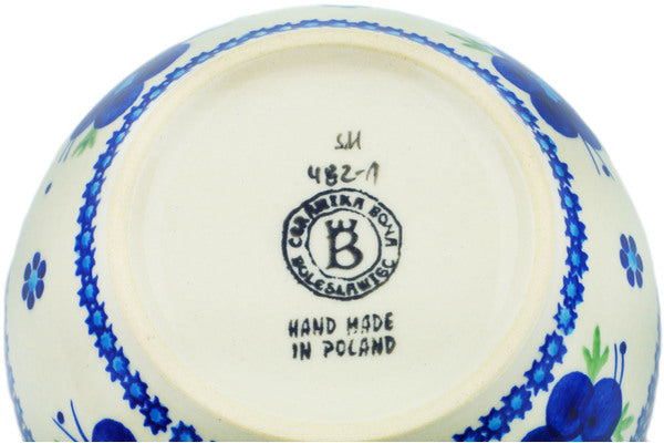 This Polish Pottery Bowl is handmade and handpainted by the Ceramika Bona factory in Boleslawiec, Poland. Manufacturer item number H8750M. It is 2½" high and measures 5¼" by 5¼". The capacity of this Bowl is 16.23 oz (brimful) and it weighs 0.7 lbs. It is part of the Bleu-Belle Fleur Collection.