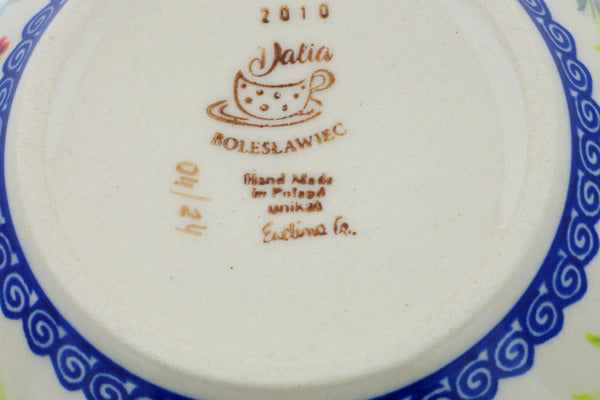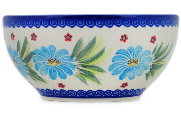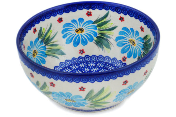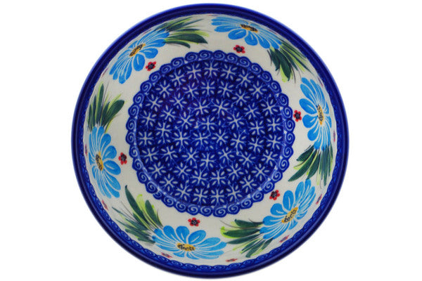 This Polish Pottery Bowl is handmade and handpainted by the Dalia factory in Boleslawiec, Poland. Manufacturer item number H0956R. It is 3" high and measures 6¼" by 6¼". The capacity of this Bowl is 23.20 oz (brimful) and it weighs 1.2 lbs. It is part of the Blue Daisy Dance Collection.