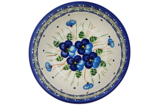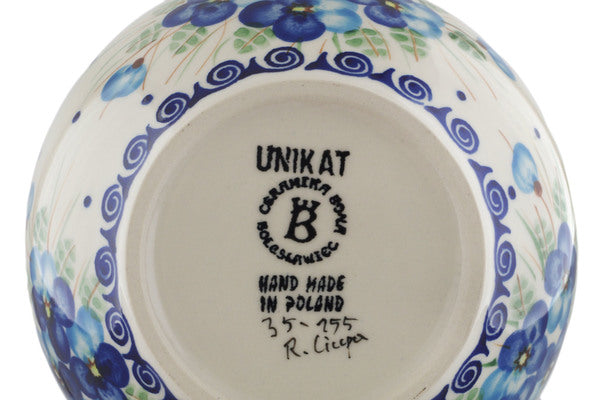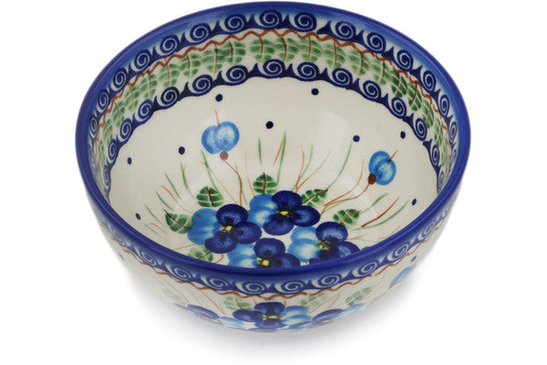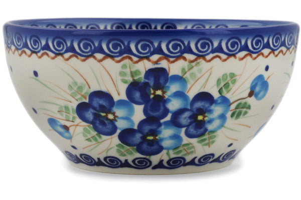 This Polish Pottery Bowl is handmade and handpainted by the Ceramika Bona factory in Boleslawiec, Poland. Manufacturer item number H0641H. It is 3¼" high and measures 6¼" by 6¼". The capacity of this Bowl is 25.19 oz (brimful) and it weighs 1.1 lbs. It is part of the Blue Pansy Collection.