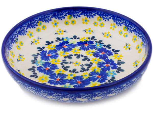 This Polish Pottery Bowl is handmade and handpainted by the Ceramika Bona factory in Boleslawiec, Poland. Manufacturer item number H8483Q. It is 1¼" high and measures 6¼" by 6¼". The capacity of this Bowl is 10.62 oz (brimful) and it weighs 0.7 lbs. It is part of the Cornflower Meadow Collection.