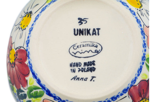 This is a Polish pottery Unikat (Signature) Bowl, which means that it has been hand painted with both sponges and brushes and it is signed by the artist who painted it. Unikat pieces are the most intricate works of art. Larger Unikat items take hours of very careful work to finish.
