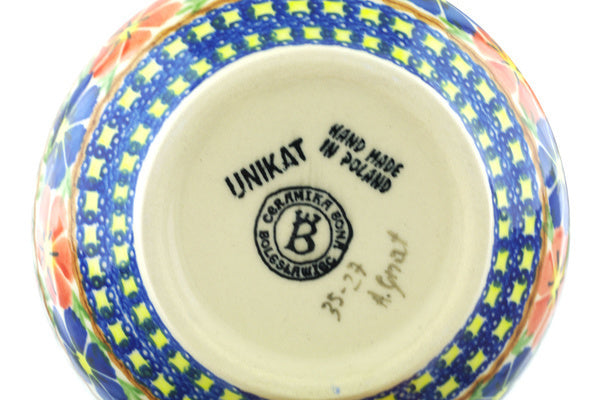 This Polish Pottery Bowl is handmade and handpainted by the Ceramika Bona factory in Boleslawiec, Poland. Manufacturer item number H6422F. It is 3¼" high and measures 6¼" by 6¼". The capacity of this Bowl is 25.19 oz (brimful) and it weighs 1.1 lbs. It is part of the Paradise Poppy Collection.