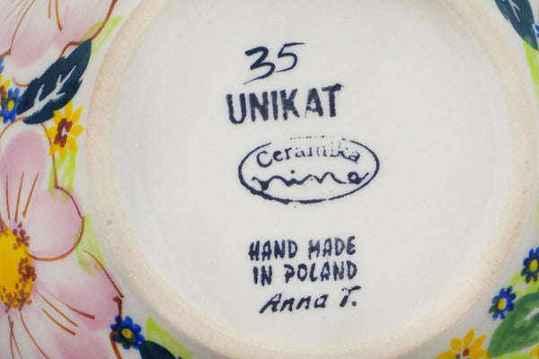 This is a Polish pottery Unikat (Signature) Bowl, which means that it has been hand painted with both sponges and brushes and it is signed by the artist who painted it. Unikat pieces are the most intricate works of art. Larger Unikat items take hours of very careful work to finish.