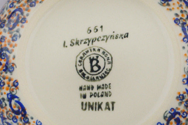 This is a Polish pottery Unikat (Signature) Bowl, which means that it has been hand painted with both sponges and brushes and it is signed by the artist who painted it. Unikat pieces are the most intricate works of art. Larger Unikat items take hours of very careful work to finish.