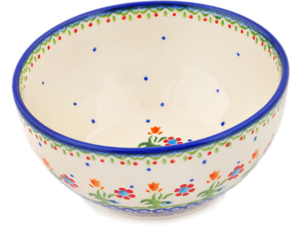 This Polish Pottery Bowl is handmade and handpainted by the Ceramika Bona factory in Boleslawiec, Poland. Manufacturer item number H3597P. It is 3" high and measures 6¼" by 6¼". The capacity of this Bowl is 27.52 oz (brimful) and it weighs 1.0 lbs. It is part of the Spring Flowers Collection.