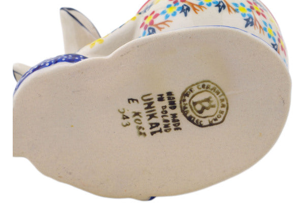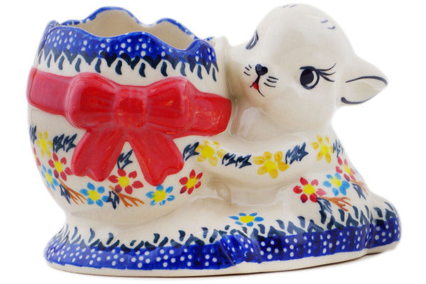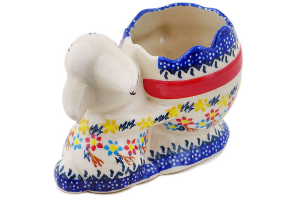 This Polish Pottery Bunny Shaped Jar is handmade and handpainted by the Ceramika Bona factory in Boleslawiec, Poland. Manufacturer item number H1961Q. It is 4¼" high and measures 6¼" by 4". The weight of this Bunny Shaped Jar is 1.4 lbs. It is part of the Spring Flower Ring Collection.