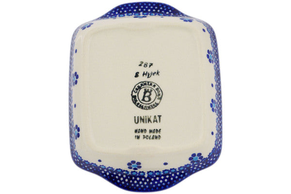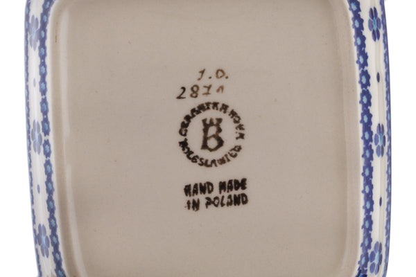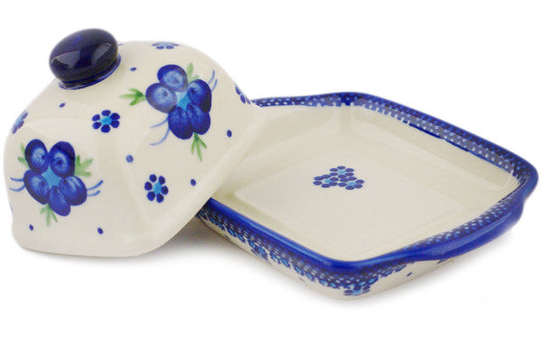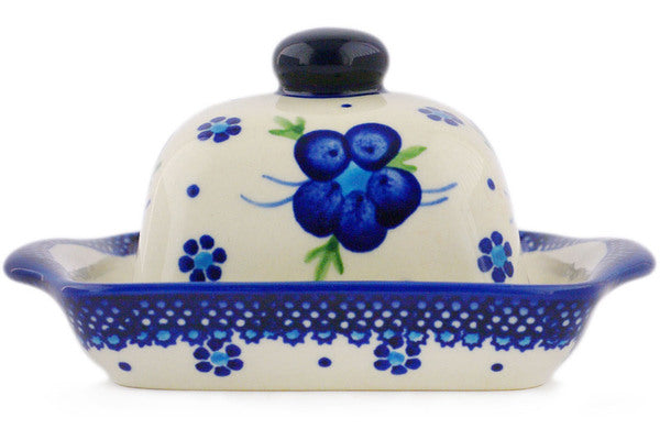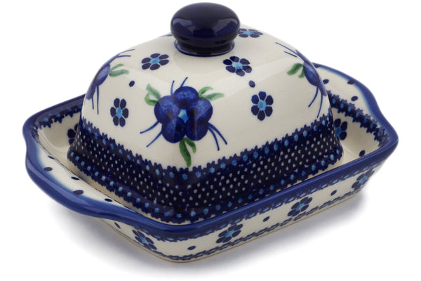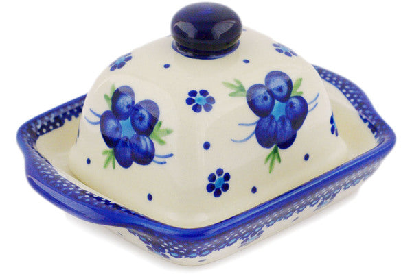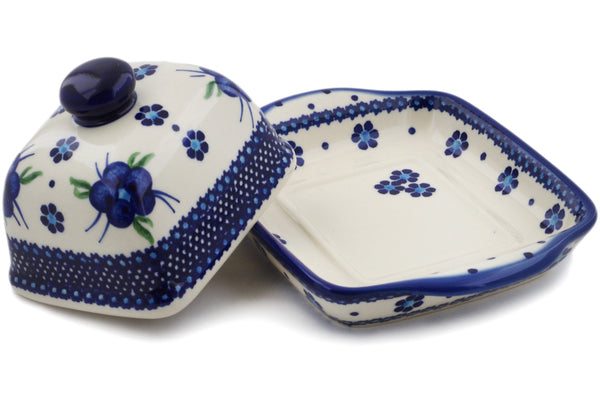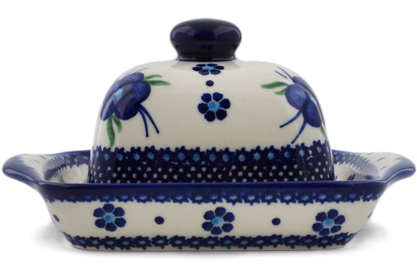 This Polish Pottery Butter Dish is handmade and handpainted by the Ceramika Bona factory in Boleslawiec, Poland. Manufacturer item number H7323K. It is 3¼" high and measures 6½" by 5". The weight of this Butter Dish is 1.4 lbs. It is part of the Bleu-Belle Fleur Collection.