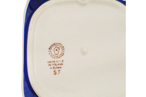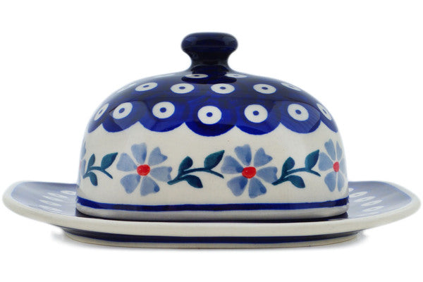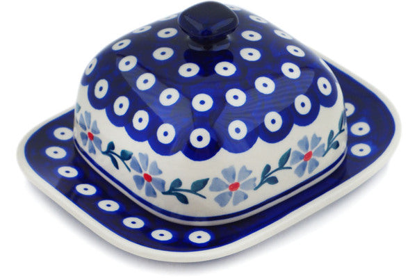 This Polish Pottery Butter Dish is handmade and handpainted by the Manufaktura factory in Boleslawiec, Poland. Manufacturer item number H7235O. It is 3¼" high and measures 6½" by 5¼". The weight of this Butter Dish is 1.3 lbs. It is part of the Peacock Forget-Me-Not Collection.
