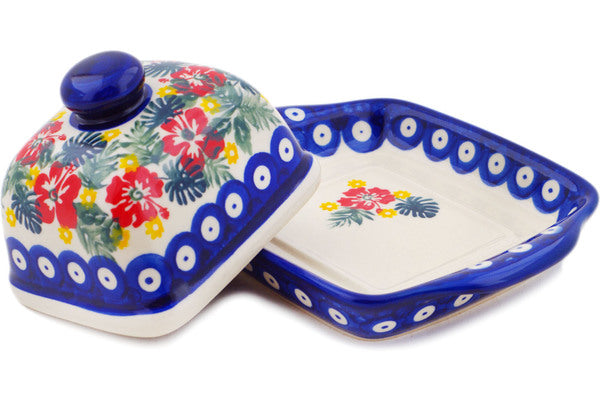 This Polish Pottery Butter Dish is handmade and handpainted by the Ceramika Bona factory in Boleslawiec, Poland. Manufacturer item number H1780P. It is 3¼" high and measures 6½" by 5". The weight of this Butter Dish is 1.4 lbs. It is part of the Tropical Peacock Collection.