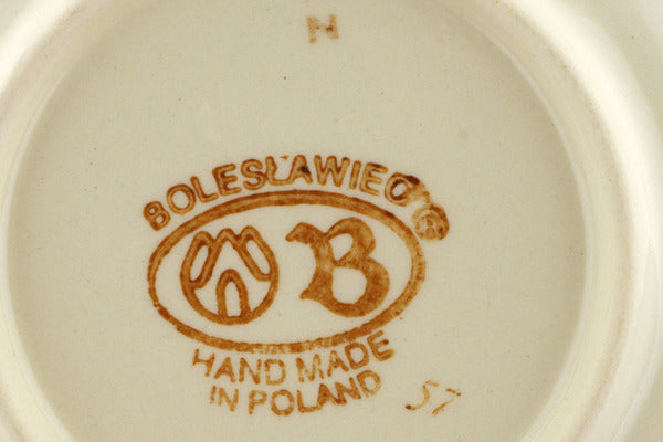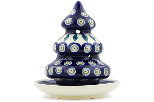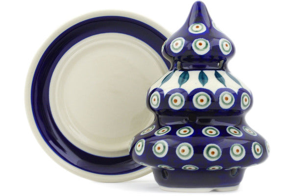 This Polish Pottery Christmas Tree Candle Holder is handmade and handpainted by the Zaklady Ceramiczne factory in Boleslawiec, Poland. Manufacturer item number H5888D. It is 6½" high and measures 5¾" by 5¾". The weight of this Christmas Tree Candle Holder is 1.4 lbs. It is part of the Peacock Leaves Collection.