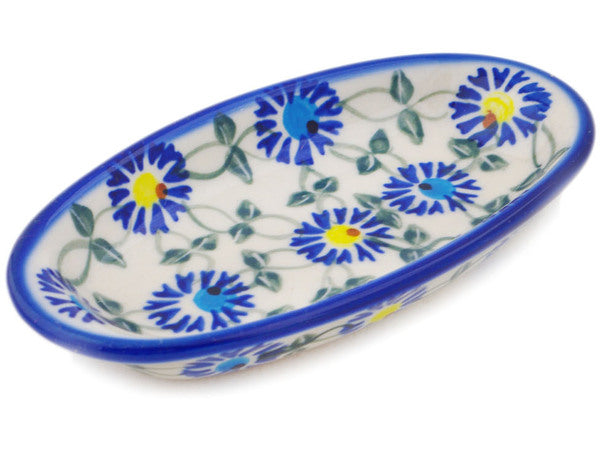 This Polish Pottery Condiment Dish is handmade and handpainted by the Ceramika Bona factory in Boleslawiec, Poland. Manufacturer item number H2238R. It is 1" high and measures 5¾" by 2¾". The capacity of this Condiment Dish is 3.38 oz (brimful) and it weighs 0.3 lbs. It is part of the Blue Thistle Beauty Collection.