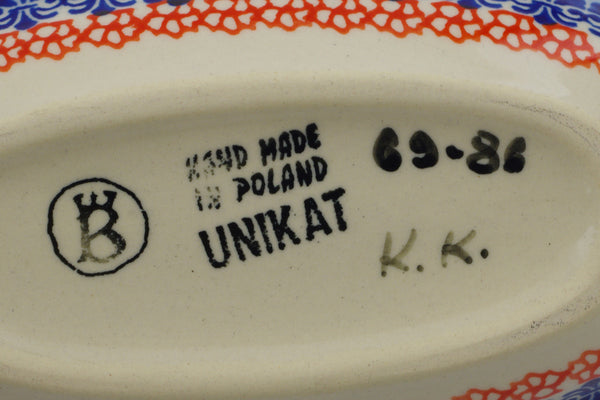 This is a Polish pottery Unikat (Signature) Condiment Dish, which means that it has been hand painted with both sponges and brushes and it is signed by the artist who painted it. Unikat pieces are the most intricate works of art. Larger Unikat items take hours of very careful work to finish.