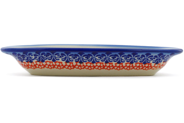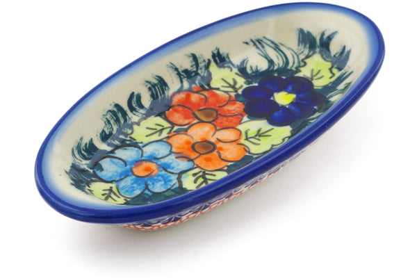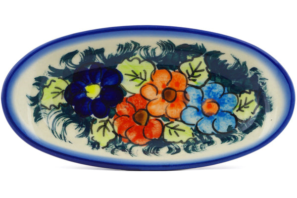 This Polish Pottery Condiment Dish is handmade and handpainted by the Ceramika Bona factory in Boleslawiec, Poland. Manufacturer item number H9020F. It is 1" high and measures 6½" by 3¼". The capacity of this Condiment Dish is 4.23 oz (brimful) and it weighs 0.4 lbs. It is part of the Butterfly Splendor Collection.