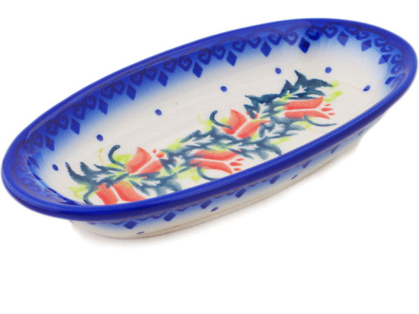This Polish Pottery Condiment Dish is handmade and handpainted by the Ceramika Bona factory in Boleslawiec, Poland. Manufacturer item number H4745Q. It is 1" high and measures 6½" by 3¼". The capacity of this Condiment Dish is 4.23 oz (brimful) and it weighs 0.4 lbs. It is part of the California Poppies Collection.