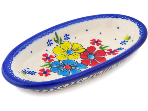 This Polish Pottery Condiment Dish is handmade and handpainted by the Ceramika Bona factory in Boleslawiec, Poland. Manufacturer item number H2133R. It is 1" high and measures 6½" by 3¼". The capacity of this Condiment Dish is 4.23 oz (brimful) and it weighs 0.4 lbs. It is part of the Country Three Collection.