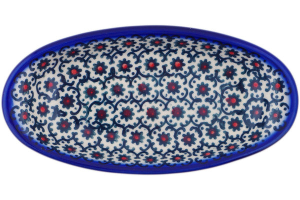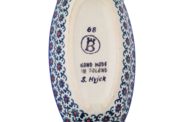 This Polish Pottery Condiment Dish is handmade and handpainted by the Ceramika Bona factory in Boleslawiec, Poland. Manufacturer item number H9731Q. It is 1" high and measures 5¾" by 2¾". The capacity of this Condiment Dish is 3.38 oz (brimful) and it weighs 0.3 lbs. It is part of the Field Of Black Daisies Collection.