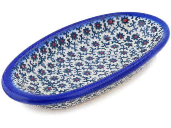 This Polish Pottery Condiment Dish is handmade and handpainted by the Ceramika Bona factory in Boleslawiec, Poland. Manufacturer item number H9730Q. It is 1" high and measures 6½" by 3¼". The capacity of this Condiment Dish is 4.23 oz (brimful) and it weighs 0.4 lbs. It is part of the Field Of Black Daisies Collection.
