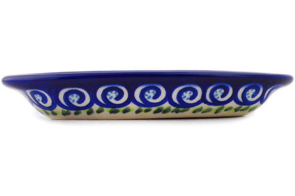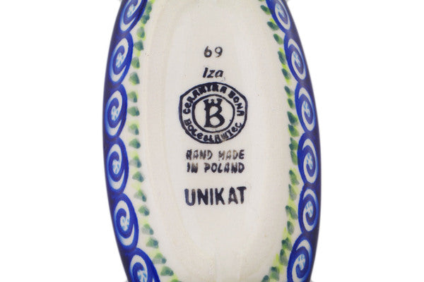 This Polish Pottery Condiment Dish is handmade and handpainted by the Ceramika Bona factory in Boleslawiec, Poland. Manufacturer item number H2132R. It is 1" high and measures 6½" by 3¼". The capacity of this Condiment Dish is 4.23 oz (brimful) and it weighs 0.4 lbs. It is part of the Gorgeous Morning Glory Collection.