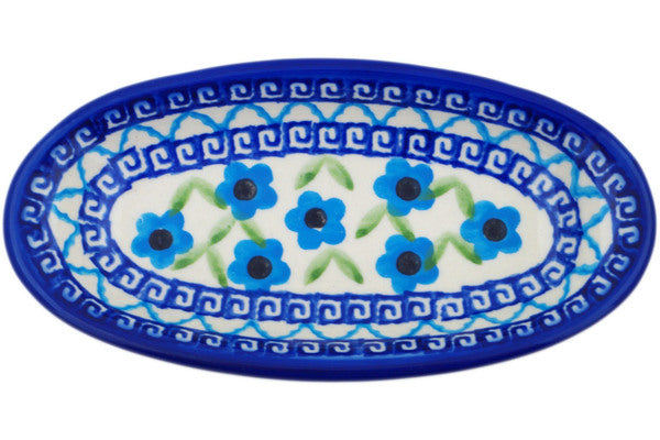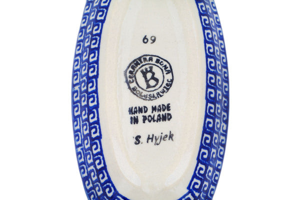 This Polish Pottery Condiment Dish is handmade and handpainted by the Ceramika Bona factory in Boleslawiec, Poland. Manufacturer item number H6764P. It is 1" high and measures 6½" by 3¼". The capacity of this Condiment Dish is 4.23 oz (brimful) and it weighs 0.4 lbs. It is part of the Greek Daisies Collection.