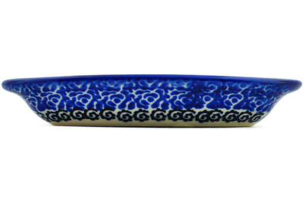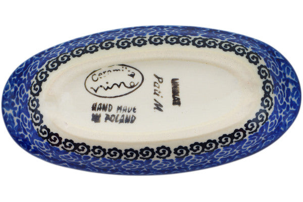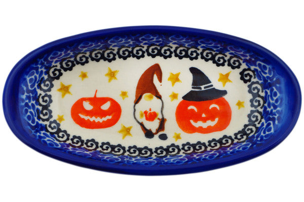 This Polish Pottery Condiment Dish is handmade and handpainted by the Ceramika Nina factory in Boleslawiec, Poland. Manufacturer item number H1536P. It is 1" high and measures 5¾" by 2¾". The capacity of this Condiment Dish is 3.38 oz (brimful) and it weighs 0.3 lbs. It is part of the Harvest Haunt Collection.