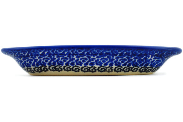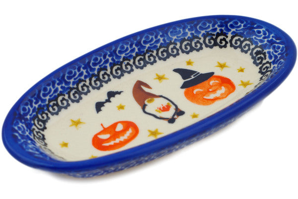 This Polish Pottery Condiment Dish is handmade and handpainted by the Ceramika Nina factory in Boleslawiec, Poland. Manufacturer item number H1546P. It is 1" high and measures 6½" by 3¼". The capacity of this Condiment Dish is 4.23 oz (brimful) and it weighs 0.4 lbs. It is part of the Harvest Haunt Collection.