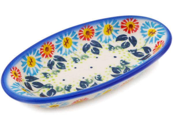 This Polish Pottery Condiment Dish is handmade and handpainted by the Ceramika Bona factory in Boleslawiec, Poland. Manufacturer item number H2129R. It is 1" high and measures 5¾" by 2¾". The capacity of this Condiment Dish is 3.38 oz (brimful) and it weighs 0.3 lbs. It is part of the Long-stemmed Beauties Collection.