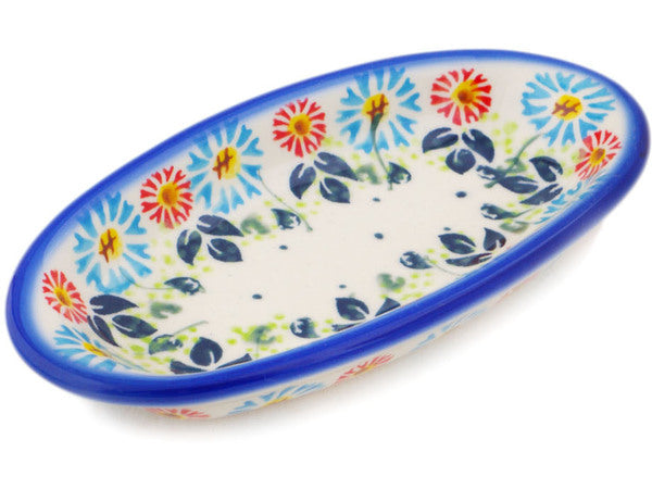 This Polish Pottery Condiment Dish is handmade and handpainted by the Ceramika Bona factory in Boleslawiec, Poland. Manufacturer item number H2131R. It is 1" high and measures 6½" by 3¼". The capacity of this Condiment Dish is 4.23 oz (brimful) and it weighs 0.4 lbs. It is part of the Long-stemmed Beauties Collection.