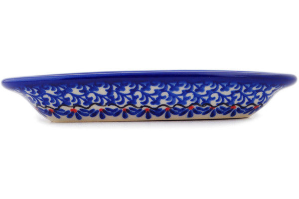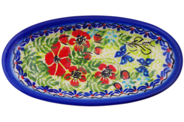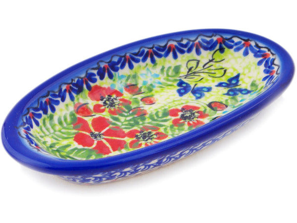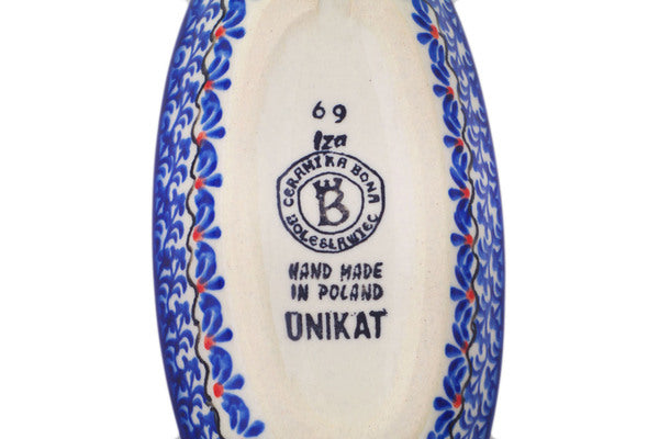 This Polish Pottery Condiment Dish is handmade and handpainted by the Ceramika Bona factory in Boleslawiec, Poland. Manufacturer item number H8783Q. It is 1" high and measures 6½" by 3¼". The capacity of this Condiment Dish is 4.23 oz (brimful) and it weighs 0.4 lbs. It is part of the Metamorphosis Collection.