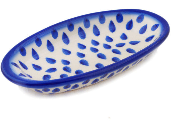 This Polish Pottery Condiment Dish is handmade and handpainted by the Ceramika Bona factory in Boleslawiec, Poland. Manufacturer item number H1166R. It is 1" high and measures 5¾" by 2¾". The capacity of this Condiment Dish is 3.38 oz (brimful) and it weighs 0.3 lbs. It is part of the Morning Dew Collection.