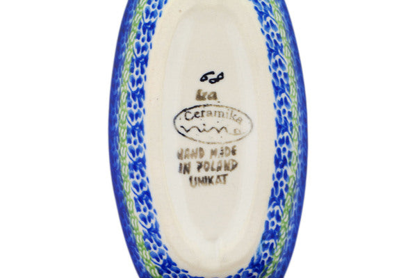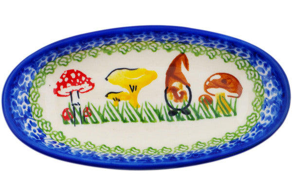 This Polish Pottery Condiment Dish is handmade and handpainted by the Ceramika Nina factory in Boleslawiec, Poland. Manufacturer item number H1530P. It is 1" high and measures 5¾" by 2¾". The capacity of this Condiment Dish is 3.38 oz (brimful) and it weighs 0.3 lbs. It is part of the Mushroom Garden Collection.
